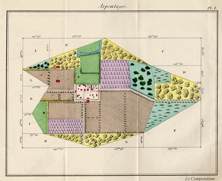 Tiré du TRAITÉ ÉLÉMENTAIRE D'ARPENTAGE de L. Lamotte (1869), ce lavis exprime, "par des teintes plates et des couleurs conventionnelles, la nature des terres" de la propriété qu'il représente. L'arpenteur a d'abord procédé au "levé du plan" c'est-à-dire à "la représentation sur papier de la forme du terrain, en imitant les détails, et en conservant les proportions de l'ensemble". Pour cela, il a réalisé sur la propriété différentes mesures à l'aide d'outils spécifiques dont les plus ordinaires sont la chaîne et l'équerre d'arpenteur. |