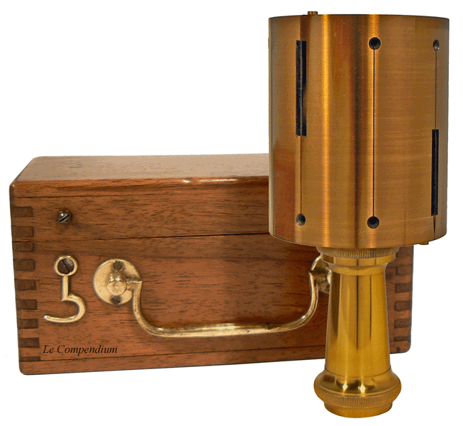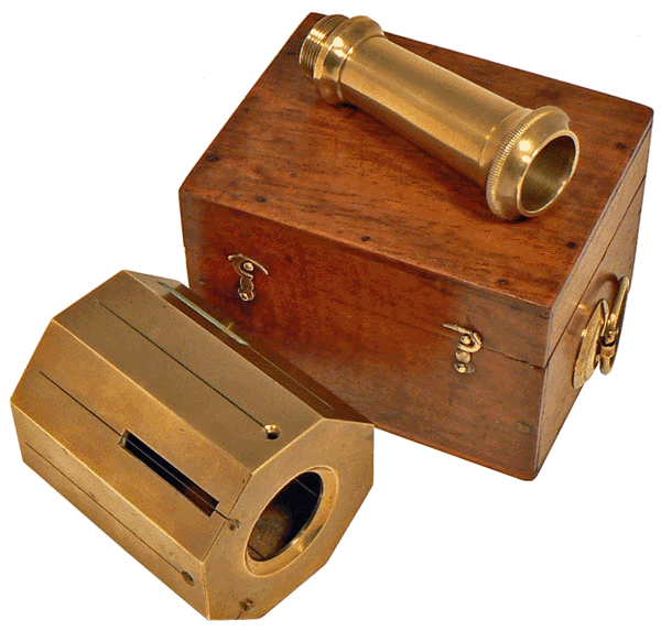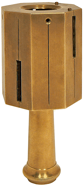 Ce premier modèle, dit octogonal, est le plus fréquemment rencontré. Une fois démonté, le pied est escamoté et vissé à l'intérieur du corps de l'instrument. Le tout occupe une faible place dans un petit et robuste coffret. |