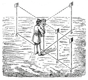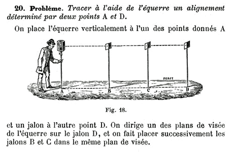 Deux exemples empruntés au MANUEL D'ARPENTAGE POUR LES ÉCOLES PRIMAIRES : le tracé de la ligne droite et l'élévation d'une perpendiculaire. Au milieu, une image de notre équerre montrant une fente et le crin qui sépare la fenêtre opposée. Lors d'une visée, l'arpenteur-géomètre superpose cette image à celle de la mire placée à distance et généralement tenue par son aide : alors, la fente, le crin et la mire forment une droite qu'il suffit de matérialiser en plaçant des jalons sur le terrain ... |
