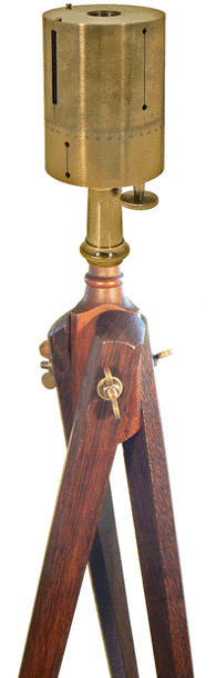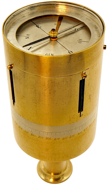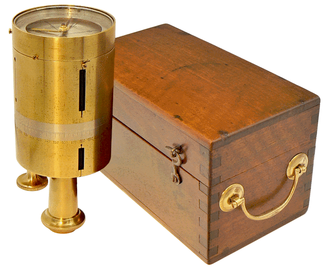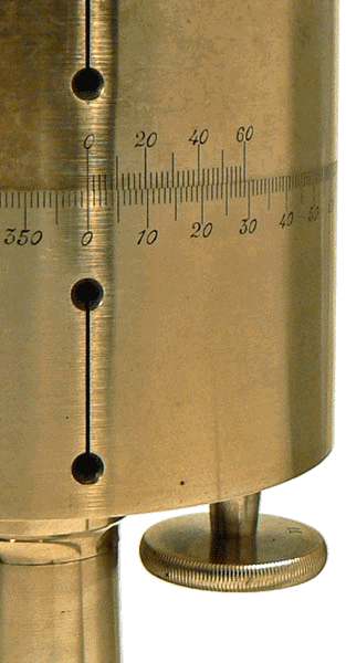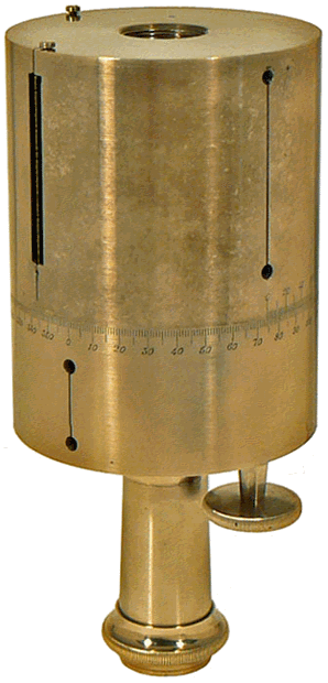Le cylindre inférieur est gradué en degrés, de 0° à 360°. Le vernier au 1/30 porté par le cylindre supérieur permet une lecture avec une précision de 2 minutes. |
