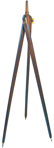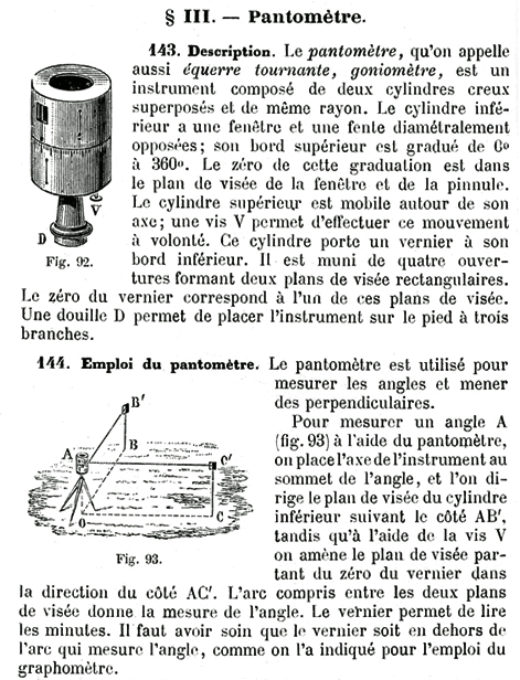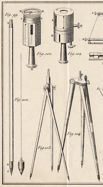 Les Fig. 99, 103 et 104 représentent les supports utilisés par les arpenteurs pour positionner les équerres et les autres instruments : le "bâton d'arpenteur ou pied à douille", le "pied à trois branches" et le "pied à six branches, réunies deux à deux". |