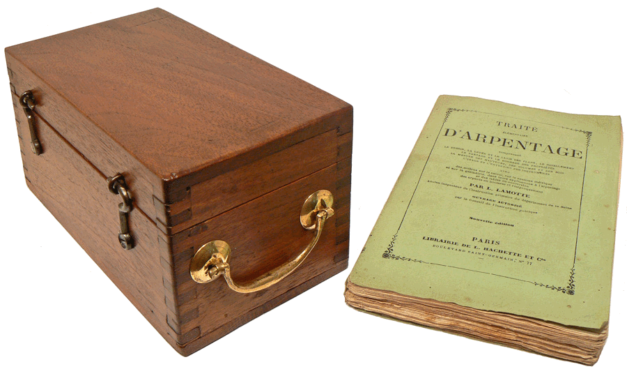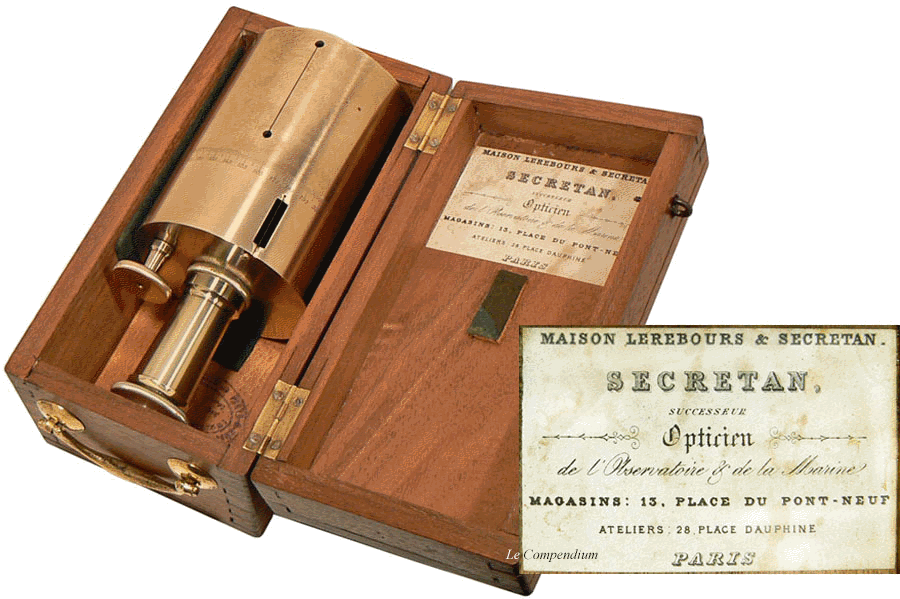 Le coffret de ce premier instrument porte l'étiquette de la Maison Lerebours et Secretan (Secretan, successeur). Il appartenait au Service municipal de Paris comme l'indique la marque du tampon dans le fond du coffret. |