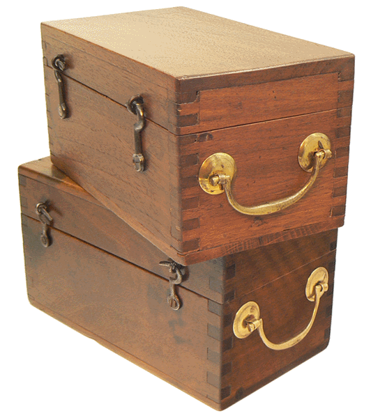 Dans leur coffret en noyer, les modèles présentés sur cette page : deux pantomètres ou équerres tournantes dites "à pignon, par dessous". |