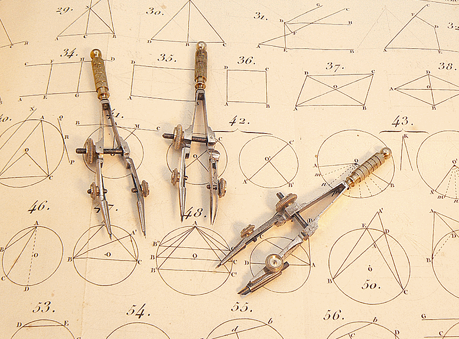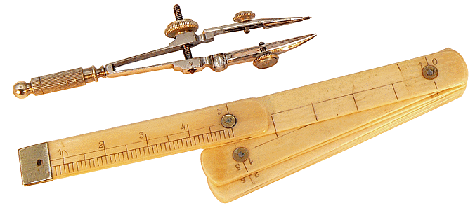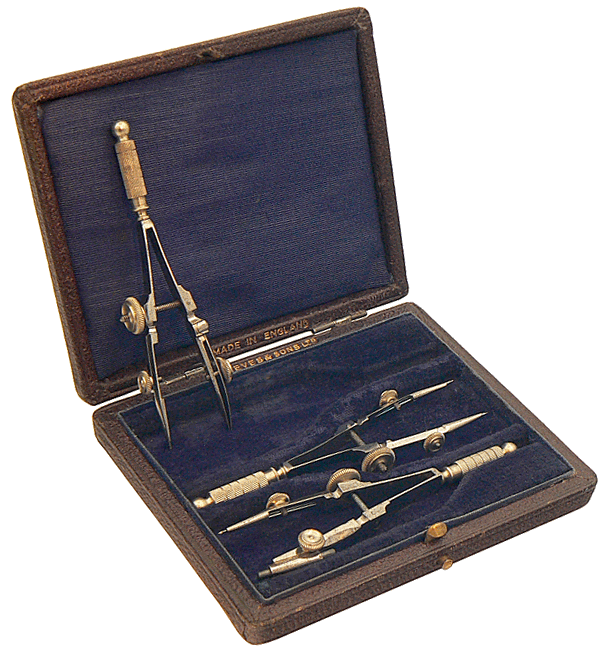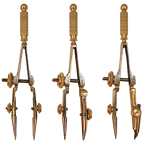 Le nom de balustre vient de la forme de l'appendice, souvent élégant, terminant le compas et tenu entre le pouce et l'index pour le faire tourner sur lui-même lors du tracé. Les trois modèles de compas à balustre sont présents ici : le compas à pointes sèches, le compas tire-ligne pour l'encre et enfin celui à mine. |