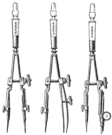 Dans son "EXTRAIT DU FORMULAIRE DE L'INGENIEUR Suivi de la Description DES INSTRUMENTS DE MATHÉMATIQUES, des Règles à Calculs, etc.", de 1910, H. Morin présente différents compas à balustre spécialement conçus pour tracer, avec précision, des circonférences de très petit rayon. |