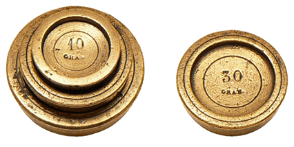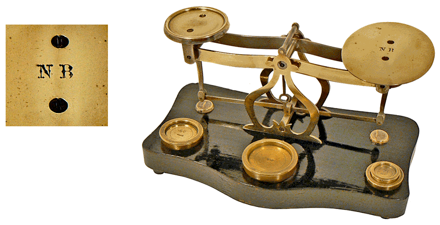Le troisième modèle, ci-dessous est signé NB pour Narcisse BRIAIS, constructeur français de la deuxième partie du 19e siècle. Les poids godets qui l'accompagnent sont marquées en grammes (10 - 30 - 50 et 100 g). |