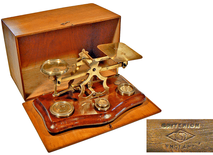 Il s'agit de petites balances du type Roberval utilisées pour peser le courrier ou, plus exactement, pour définir la tranche d'affranchissement applicable au courrier. Le plateau de gauche, plus petit et généralement circulaire, est destiné à recevoir les "poids godets", de forme caractéristique, tandis que le plateau de droite reçoit la lettre. Au repos, les poids sont logées dans le socle en bois dont la longueur avoisine les 20 centimètres. |