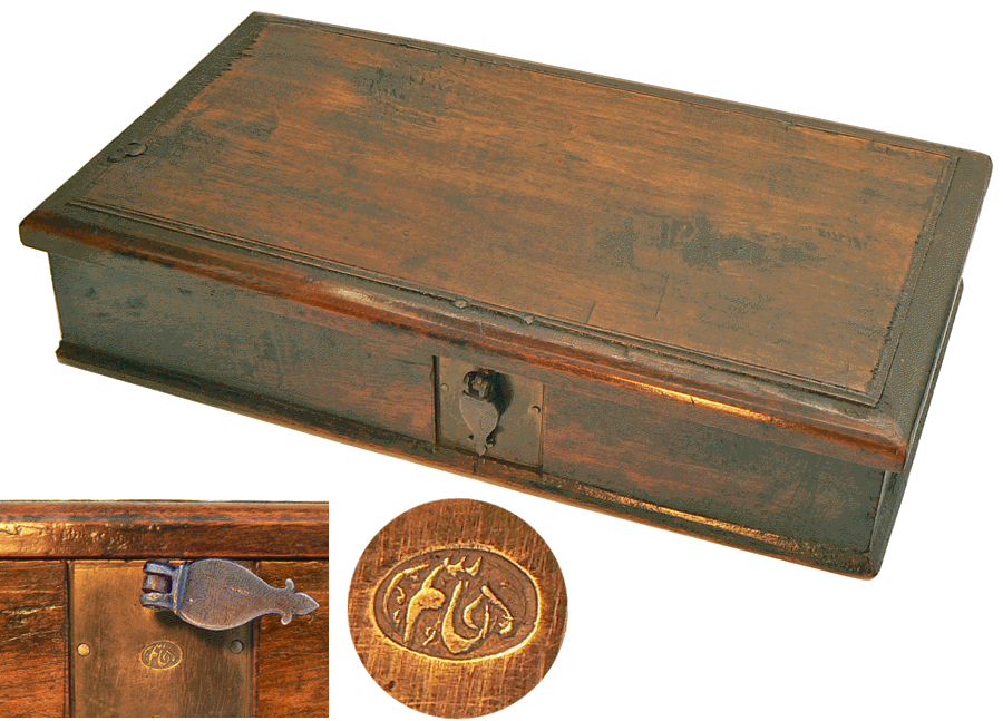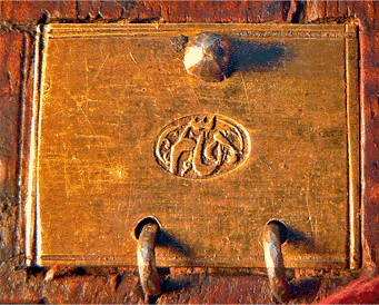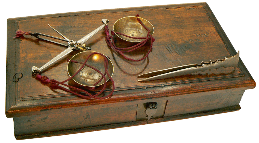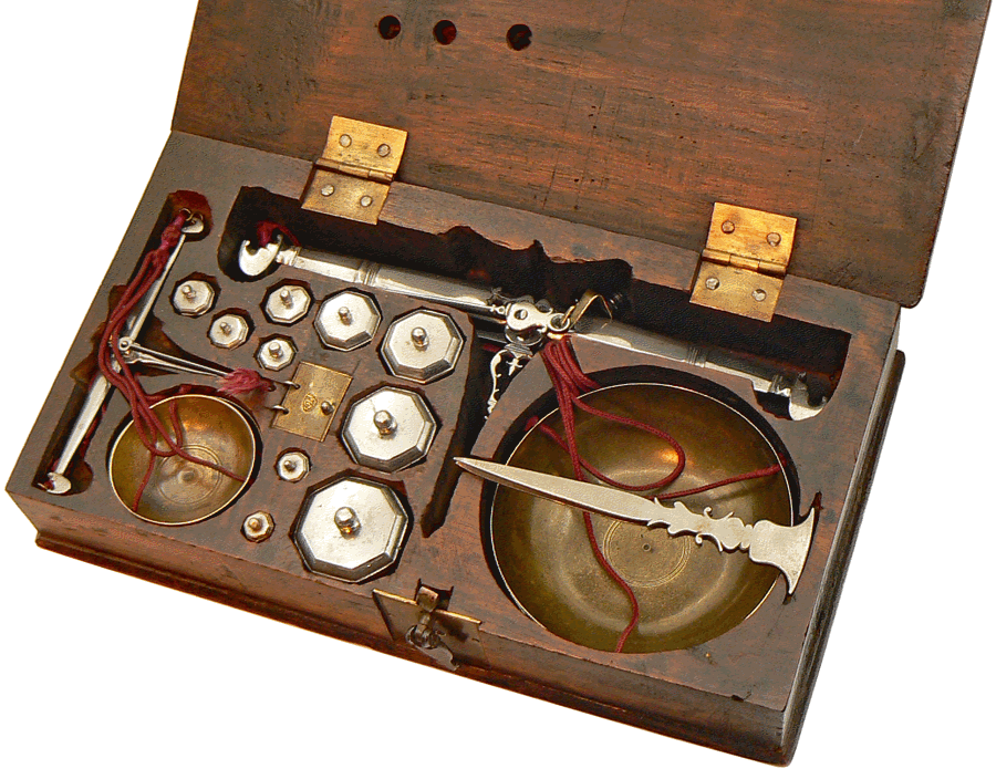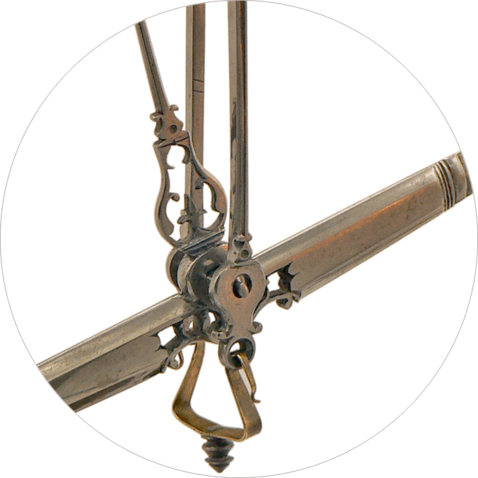 Tout a été prévu. La pince de préhension des poids est encastrée au-dessus des plateaux du grand trébuchet et les cordons de suspension de ces plateaux passent d'un compartiment du coffret à l'autre par des petites goulottes creusées dans le bois. Au milieu des poids, une petite trappe en cuivre (image de gauche) portant la marque du fabricant protège le logement des subdivisions, aujourd'hui disparues. Fléaux, poids et pince sont en acier. Les plateaux sont en cuivre. |