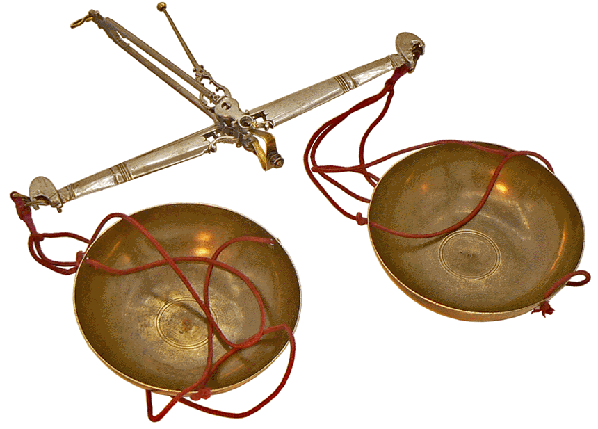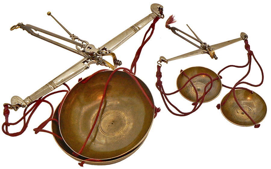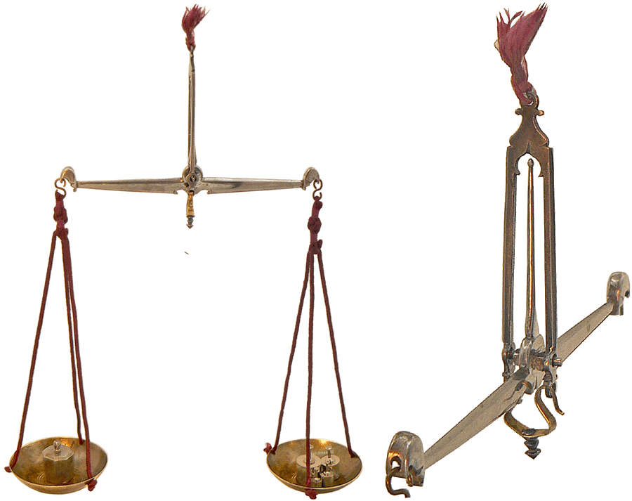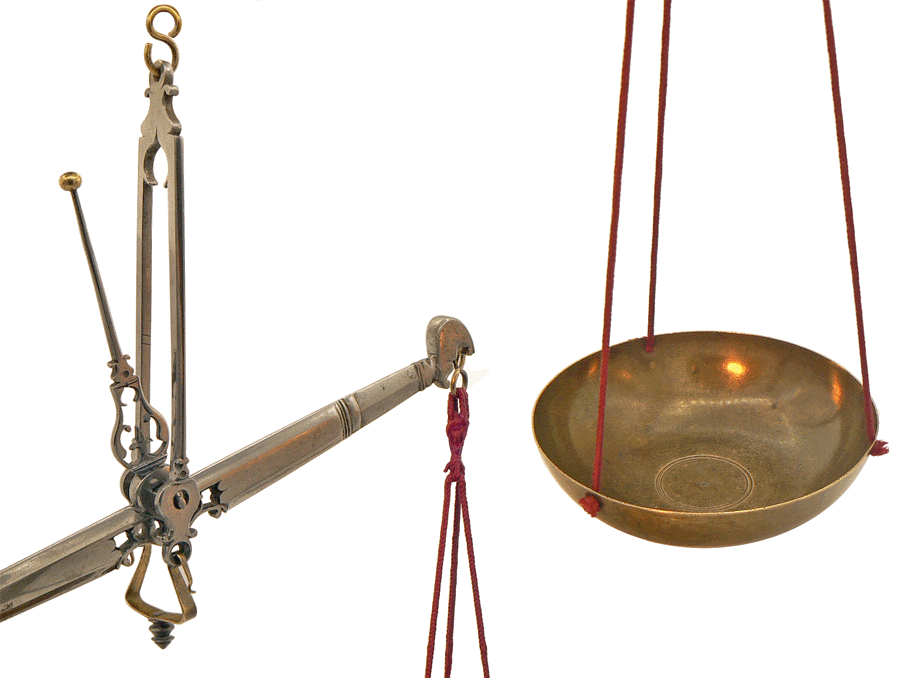 Le fléau du grand trébuchet mesure 20 cm ; le diamètre des plateaux, en forme de coupelles, est de 9 cm. |