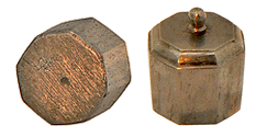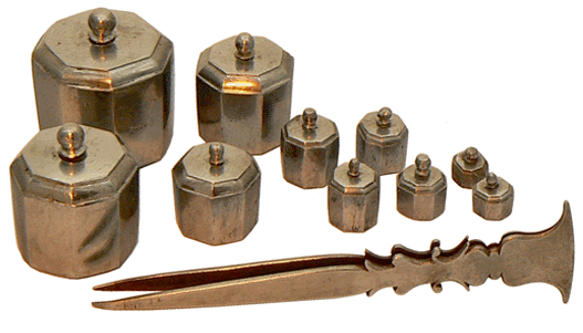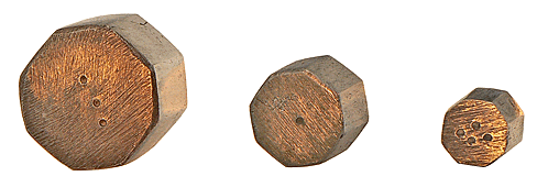 Les poids octogonaux et très légèrement ventrus, ne portent aucune indication de leur valeur mais sont repérés par un certain nombre de points frappés sur leur base. Les plus gros sont marqués par 1, 2, 3 et 5 points et cinq autres par 1, 2, 3 (pour 2 d'entre eux de même valeur) et 4 points. Nous avons déterminé la masse de chacun d'eux, avec une précision du décigramme, sans tenir compte du plus petit, trop oxydé pour prétendre à un résultat significatif. L'image qui suit montre l'équivalence entre le gros poids frappé de 1 point et les masses marquées de précision utilisées. |
