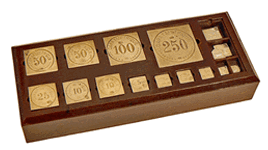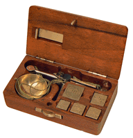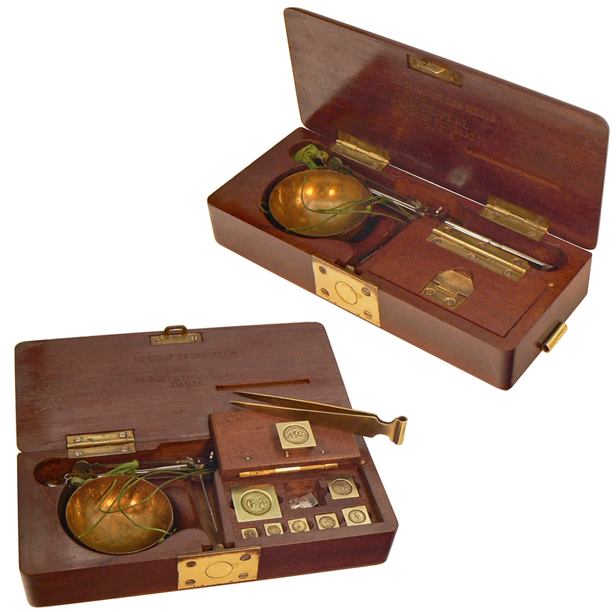 Le modèle est équipé de "poids carat" en forme de pyramide quadrangulaire tronquée, correspondant à 205 mg et dont l'utilisation à été interdite par la 4ème conférence des poids et mesures de 1907. Ces poids carat que l'on a qualifiés d'anciens à partir de leur remplacement définitif en 1910, étaient présentés en série du type 1, 2, 3, 4, 8, 16, 32, 64, 100, 200, 300, 500 et 1000, sans marquage de l'unité utilisée, à laquelle s'ajoutait un ensemble de subdivisions de 1/2, 1/4, 1/8, 1/16, 1/32 et 1/64 unité. |