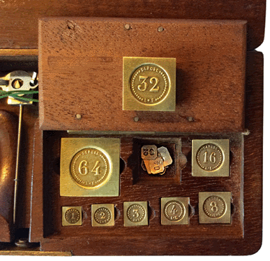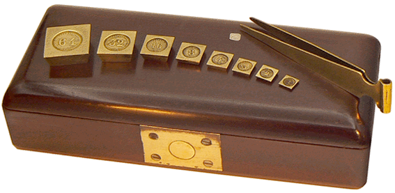 Les subdivisions (de 1/64 à 1/2 carat), sous forme de lamelles en aluminium, se rangent dans un logement ménagé sous celui du poids de 32 carats. |