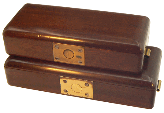 Les deux coffret sont photographiés, ici, posés l'un sur l'autre. Le plus petit est accompagné d'explications permettant d'apprécier les rapports entre le carat métrique de 0,200 g et le carat ancien de 0,205 g. On y accède en cliquant sur l'image qui suit. |