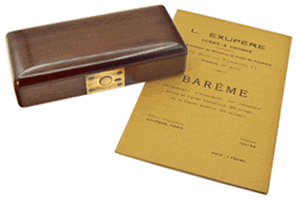 Le Compendium renferme deux balances-carat de poche de la maison L. Exupère. Le coffret du modèle le plus grand, présenté sur cette page, mesure 13,5 x 6 x 3 cm. L'autre est légèrement plus petit puisqu'il mesure 12,5 x 5,5 x 3 cm. |