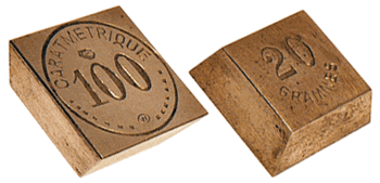 100 carats métriques. L'unité est indiquée en toutes lettres (par les lettres CM pour les plus petits poids) ainsi que la correspondance en grammes. |