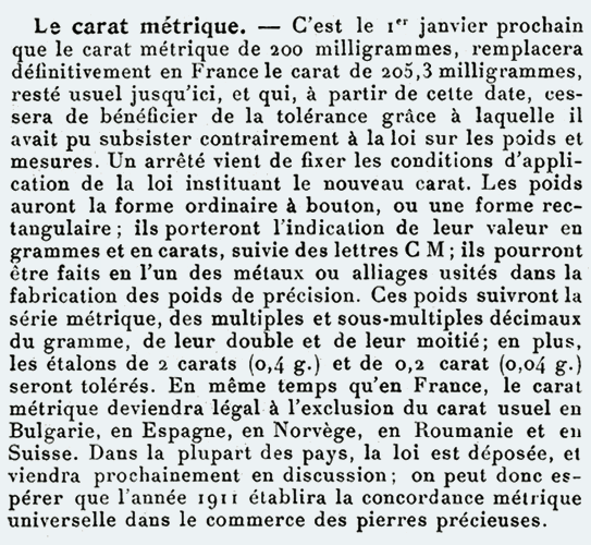 L'article de l'hebdomadaire LA NATURE du 31 décembre 1910 annonce la fin officielle du carat de 205 mg et son remplacement par le carat métrique de 200 mg. |