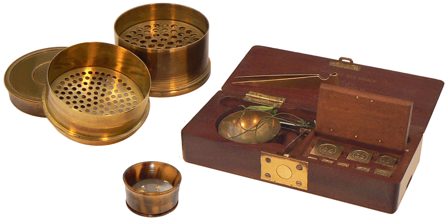 Sur le terrain ou en voyage, la petite boîte tamis pour trier et mesurer les pierres et les perles, la loupe à monture en corne pour les observer, les vérifier, et la balance-carat pour en déterminer le poids. Il reste à trouver les pierres précieuses, les perles fines et les diamants... |