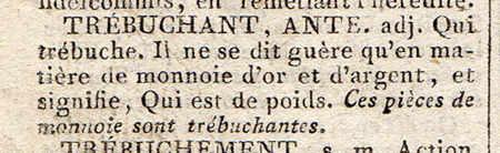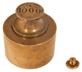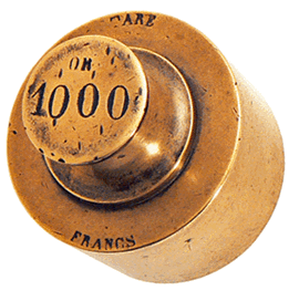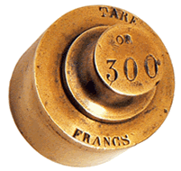 A gauche, la tare 1000 francs or pèse presque 322,60 g ce qui correspond à 50 Louis d'or ou Napoléon de 20 francs. A droite, la plus petite tare, qui correspondant à 5 francs or, pèse un peu plus de 1,60 g, masse qui caractérise la petite pièce de 5 francs or représentant Napoléon III. Il est donc facile, en utilisant certaines des tares de la série et en particulier les tares de valeurs 100, 50, 20, 10 et 5 francs or, de vérifier si l'une ou l'autre des pièces en or est "trébuchante" c'est-à-dire, en se référant au DICTIONNAIRE DE L'ACADÉMIE FRANÇAISE de 1798, si elle "est de poids". |