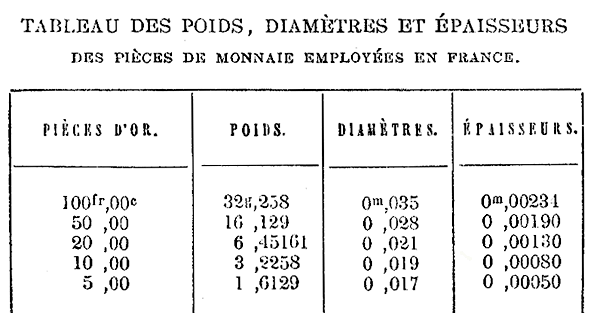 La pesée simple de la tare "20 francs or" est réalisée au trébuchet et avec une précision de 5 cg. Le résultat obtenu est 6,45 g. Cette masse correspond, compte tenu de l'incertitude qui accompagne la mesure, à la valeur relevée dans le Tableau des poids, diamètres et épaisseurs emprunté au DICTIONNAIRE GÉNÉRAL DES SCIENCES (en 1880) de Privat-Deschanel et Focillon : il s'agit de la masse de la pièce de monnaie française, le "Napoléon de 20 francs", ou "Louis d'Or" ... |