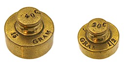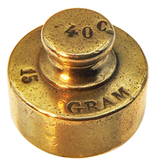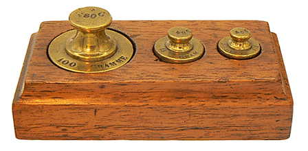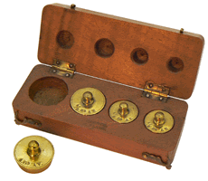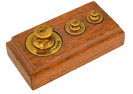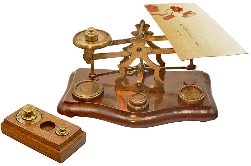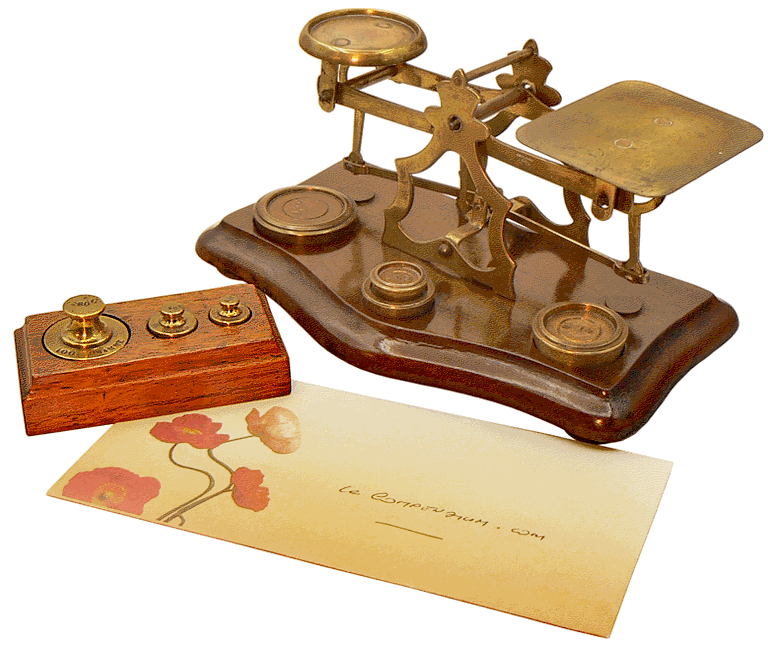 Pour déterminer le montant de l'affranchissement d'une lettre, nous utilisons ici une balance pèse-lettres en laissant de côté la série de poids-godets rangés sur son socle au profit de nos poids postaux. |