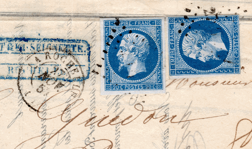 Il s'agit, ici, de deux timbres à 20 centimes non dentelés, à l'effigie de Napoléon III. Il faut attendre le début des années 1860 pour que les feuilles d'impression de ce même timbre soit proposées avec une perforation facilitant sa séparation en formant ainsi sa dentelure... |