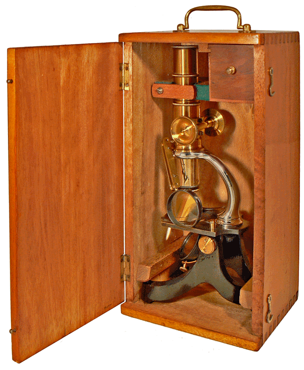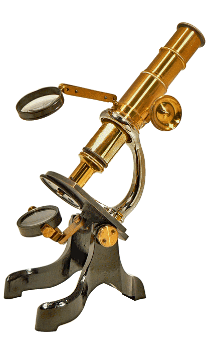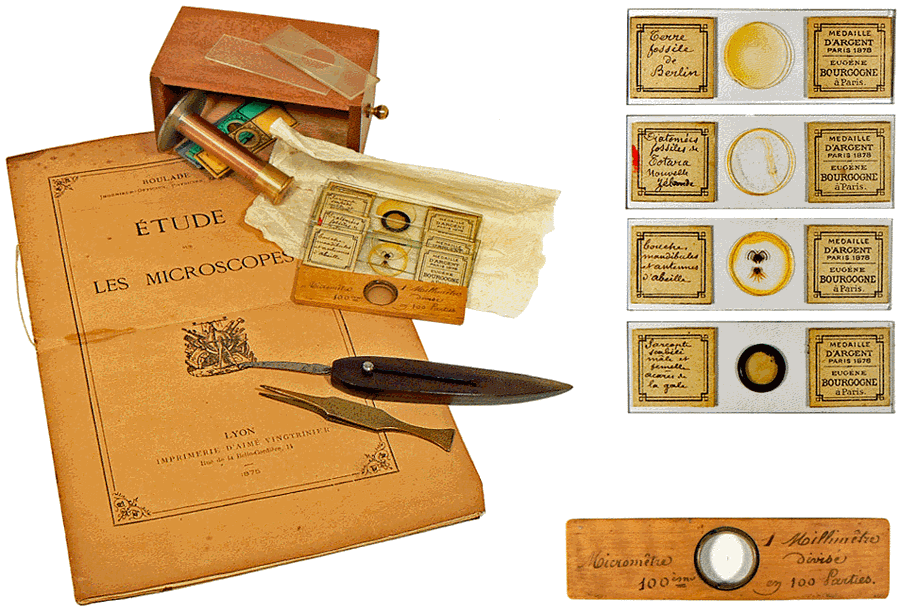 Accompagnant l'instrument, un livret de 8 pages édité en 1875 - ETUDE SUR LES MICROSCOPES - que Claude BOULADE destine "aux jeunes élèves en pharmacie ou en médecine, en leur donnant quelques conseils élémentaires pour les guider dans la pratique (...)", un microtome de Ranvier, un scalpel à lame rétractable dans son manche en ébène, une pince fine, quatre préparations signées Eugène BOURGOGNE, trois autres petites préparations, 1 lame à concavité et un micromètre objectif au 1/100e de millimètre monté sur lame en buis ... |
