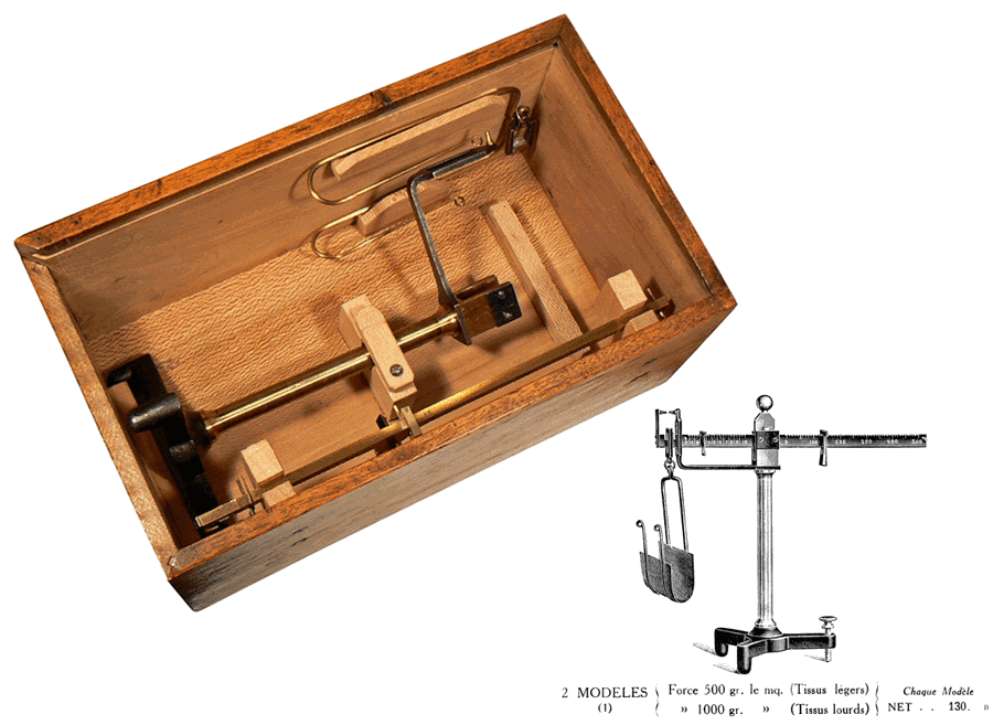 Un échantillon de tissu de 1 dm² (un gabarit métallique permet de découper un carré de 10 x 10 cm ) est placé dans le support en forme de crochet suspendu par un étrier à l'une des extrémités du fléau. L'équilibre, alors détruit, doit être rétabli en déplaçant les deux curseurs. |