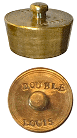 Ces tares monétaires ont une forme tronconique et possèdent un bouton de préhension. Chacune est marquée au nom de l'espèce qu'elle sert à vérifier. |