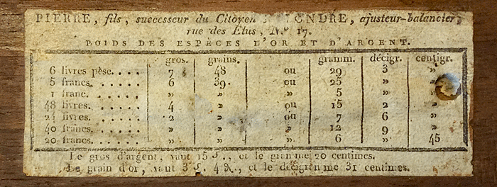 tout en étant en accord avec les valeurs du tableau des "poids des espèces d'or et d'argent" collé sur l'intérieur du couvercle. |