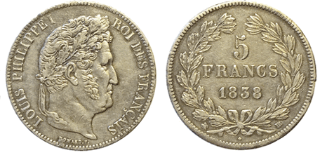 Pièce de 5 francs "LOUIS PHILIPPE I lauré" en argent - diamètre 37 mm - 1838 |