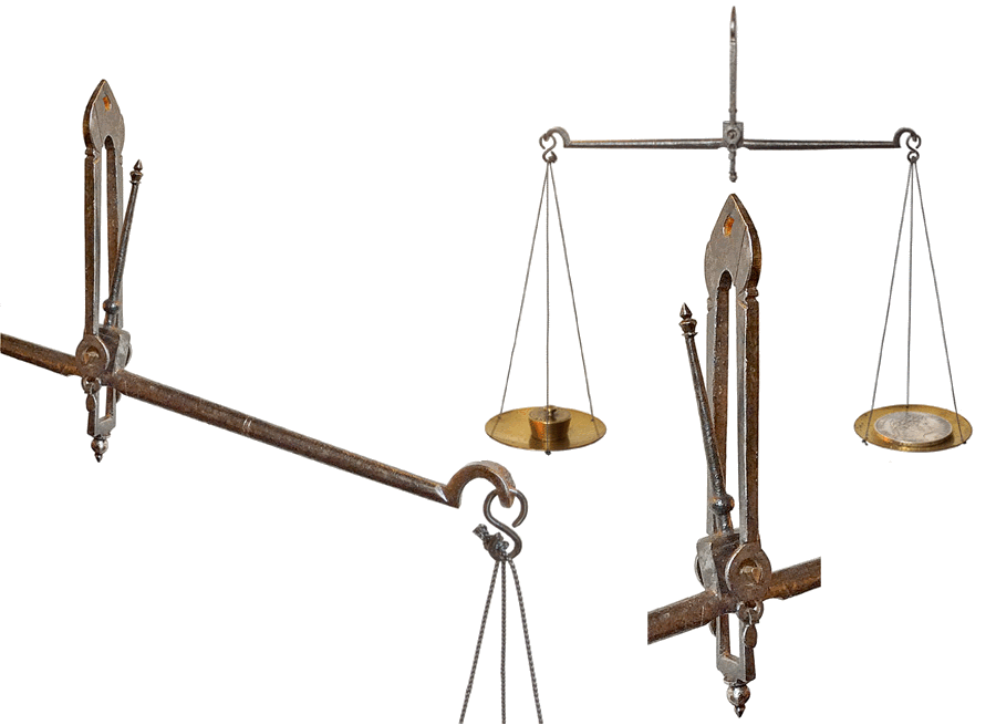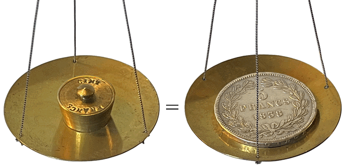 La pièce à l'effigie de Louis Philippe I, "pièce de cent sous", équilibre exactement le poids marqué CINQ FRANCS. |