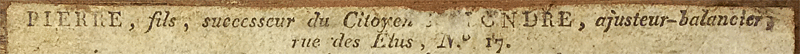 Le tableau, à l'intérieur du couvercle, renseigne sur le nom du constructeur de la boîte de pesage : PIERRE, fils, présenté comme le successeur d'un ajusteur-balancier dont seules les dernières lettres du patronyme subsistent : "xxxxNDRE". Une recherche en ligne mène au "Citoyen LALANDRE ajusteur balancier, rue des Elus N° 17" (à Reims), mentionné à l'occasion de la vente passée d'une boîte déclarée datant de 1800-1810 et contenant 7 poids. Il ne reste aucune image de la boite faisant l'objet de la transaction... |