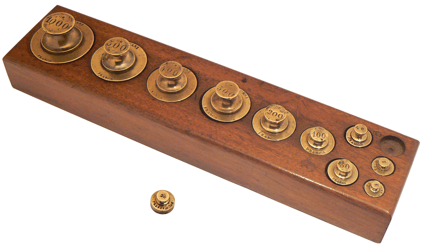 A gauche, la tare 1000 francs or pèse presque 322,60 g ce qui correspond à 50 Louis d'or ou Napoléon de 20 francs. A droite, la plus petite tare, qui correspondant à 5 francs or, pèse un peu plus de 1,60 g, masse qui caractérise la petite pièce de 5 francs or représentant Napoléon III. Il est donc facile, en utilisant certaines des tares de la série et en particulier les tares de valeurs 100, 50, 20, 10 et 5 francs or, de vérifier si l'une ou l'autre des pièces en or est "trébuchante" c'est-à-dire, en se référant au DICTIONNAIRE DE L'ACADÉMIE FRANÇAISE de 1798, si elle "est de poids". |