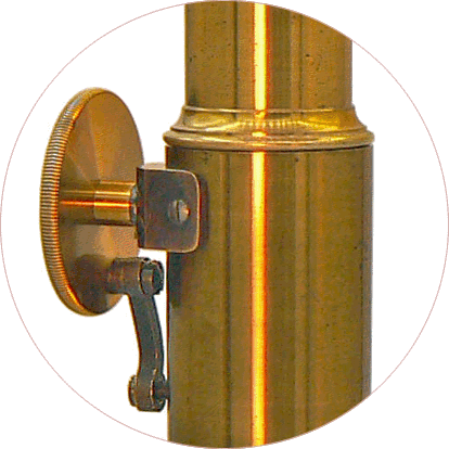 Sur l'image de gauche, on distingue la fenêtre qui guide, de bas en haut, la vis solidaire du tube optique lors du mouvement de la bielle, c'est-à-dire lorsque l'observateur réalise la mise au point en tournant le bouton moleté. |