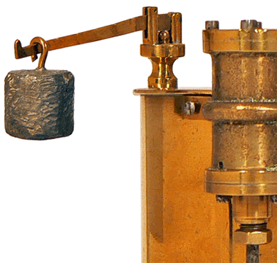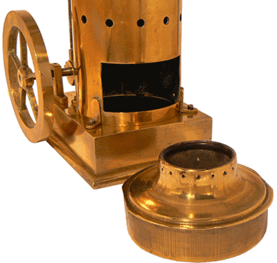 Sur l'enveloppe cylindrique de la chaudière, le robinet supérieur correspond au trop plein du réservoir d'eau, générateur de vapeur, tandis que le robinet inférieur est utilisé pour la vidange. En haut de la machine, au dessus des robinets, on distingue le bouchon à vis destiné au remplissage en eau du réservoir. |