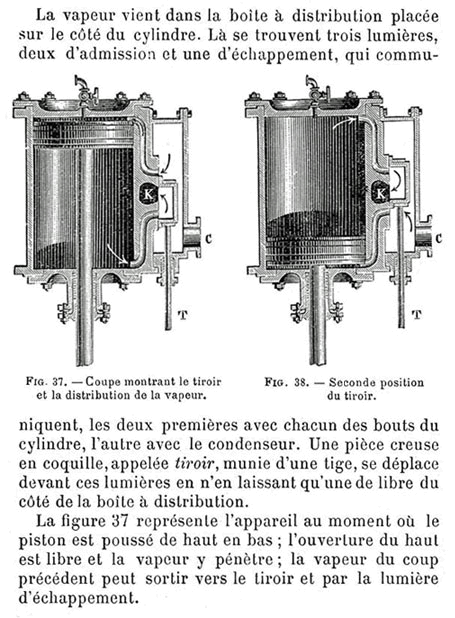 La tige (T) qui tire ou pousse le tiroir afin d'amener la vapeur au dessus ou au dessous du piston est actionnée par un excentrique solidaire de l'arbre et situé entre la manivelle actionnée par le piston et le volant. L'excentrique est un organe qui sert à transformer le mouvement circulaire continu en mouvement rectiligne alternatif. Il se compose d'une pièce circulaire fixée à l'arbre, mais de manière que O, le centre de rotation decelui-ci, ne coïncide pas avec le centre de la pièce. Pour utiliser ce mouvement, on entoure l'excentrique d'un collier dans lequel il peut tourner librement comme le doigt dans un anneau. Il résulte que pendant la rotation de l'arbre, l'excentrique tournant seul, le collier ne fait que s'élever ou s'abaisser. C'est en transmettant ensuite son mouvement à la tige (T) qu'il actionne le tiroir... |