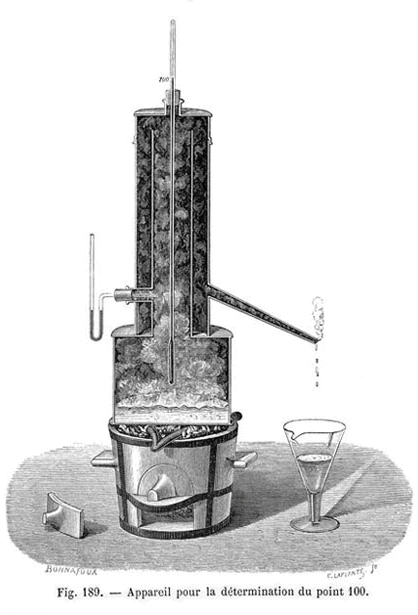 Le thermomètre muni du bouchon en liège n'est pas encore gradué. Après repérage des deux points fixes - le "zéro" dans la glace fondante et le "100" dans la vapeur d'eau en ébullition de l'étuve de Regnault - l'intervalle sera divisé en 100 parties égales... |