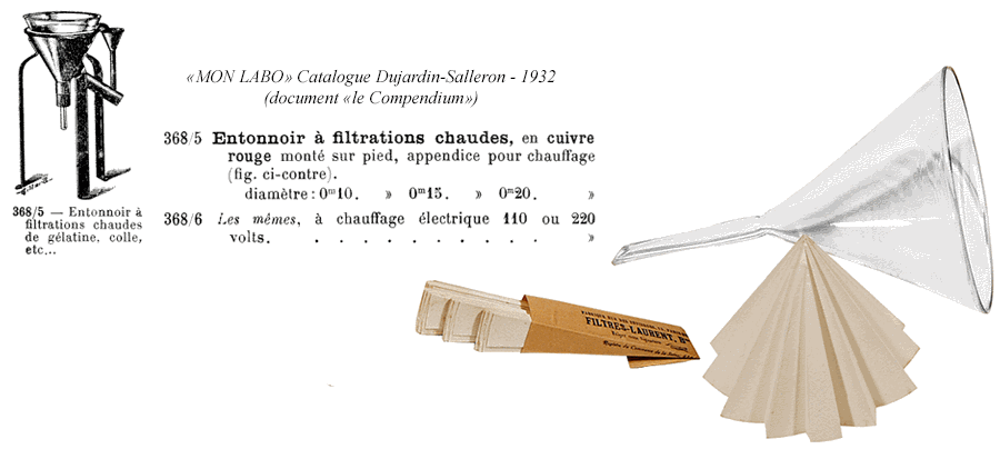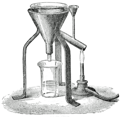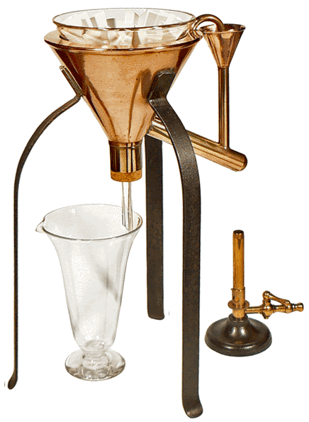L'espace compris entre l'enveloppe métallique et la paroi externe de l'entonnoir en verre, l'appendice pour le chauffage ainsi que le tube vertical évasé communiquent entre eux et contiennent de l'eau. Le bec Bunsen assure le chauffage de ce volume d'eau en son point le plus bas c'est-à-dire à l'extrémité de l'appendice de l'appareil. Un courant de convection est amorcé et l'eau, constamment en mouvement, assure une bonne régulation de la température de l'entonnoir et donc du liquide à filtrer. |