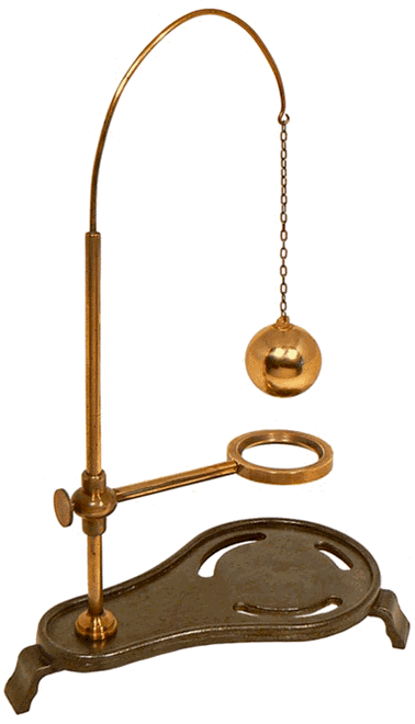 Avec cet élégant modèle, la boule préalablement chauffée est abandonnée sur l'anneau. D'abord soutenue puisque dilatée, elle tombe brusquement lors de son refroidissement et au bout d'un temps plus ou moins long ... en surprenant le spectateur. |