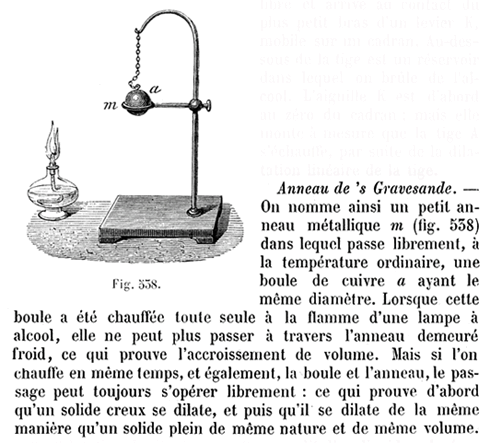 L' instrument est utilisé pour mettre en évidence la dilatation volumique des solides sous l'action de la chaleur. On le doit au philosophe mathématicien et physicien Hollandais du 18e siècle Willem Jacob 's GRAVESANDE, |