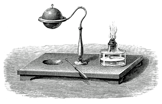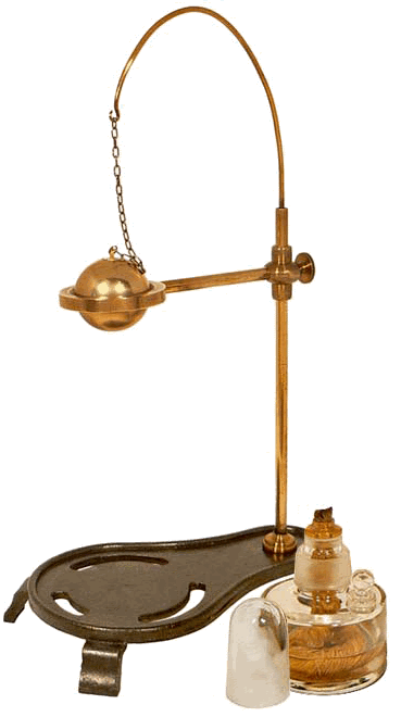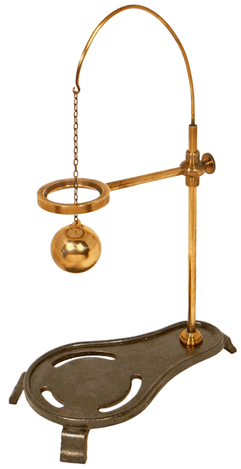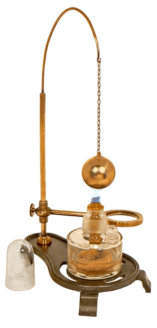 Près du brûleur à alcool, l'Anneau de 's GRAVESANDE - Diamètre de la boule 4 cm - Hauteur de l'ensemble 34 cm |