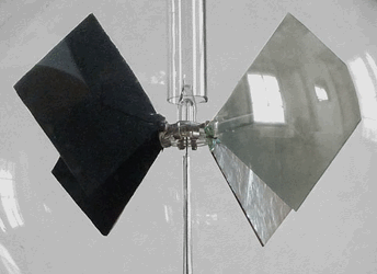 Lorsqu'elles touchent une face noire, les molécules gazeuses sont renvoyées avec une vitesse plus grande : cette face est repoussée en application de la 3ème loi de Newton relative aux actions réciproques, "toute action d'un corps sur un autre éprouve une réaction égale et contraire"... |