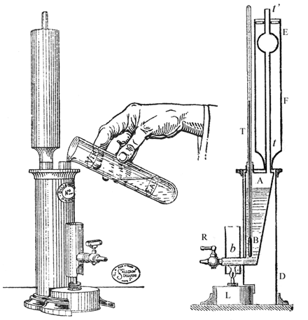 L'opération est menée en deux temps. On détermine, d'abord, la température d'ébullition de l'eau pure, au moment et au lieu de l'expérience. Pour cela, on introduit dans la chaudière la quantité d'eau prévue par le tube jaugé, on place le thermomètre dans sa tubulure et on porte l'eau à l'ébullition à l'aide de la lampe à alcool. La température devenue stable, on la relève. L'instrument est prêt pour une série de mesures réalisées au même endroit et dans les heures qui suivent. |