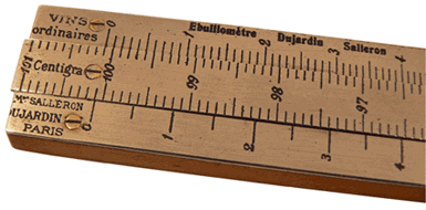 Ci-dessus, nous faisons l'hypothèse que la température d'ébullition de l'eau pure est, au moment de l'analyse, égale à 100,1°C. Le réglage de la règle de l'ébulliomètre est réalisé en faisant glisser la réglette mobile jusqu'à faire coïncider le trait 100,1 et le trait "zéro", commun aux deux échelles de richesse alcoolique (image ci-dessus). Un écrou de blocage situé au dos de la règle permet de figer ce réglage. Admettons, pour continuer, que la température d'ébullition du vin étudié est égale à 91,5 °C. On se reporte à cette valeur sur l'échelle centrale des températures et on lit, en face, sur l'échelle de droite, dite des "vins ordinaires", le degré correspondant : 11,8 °. Cela signifie que le vin contient 11,8 % d'alcool pur, en volume, évalué en degrés de l'alcoomètre légal : c'est le résultat qui serait obtenu après distillation et mesure à l'alcoomètre. Sur l'échelle de gauche, la lecture correspond à un peu plus de 12° de l'échelle Malligand (échelle de l'ébullioscope Malligand). |