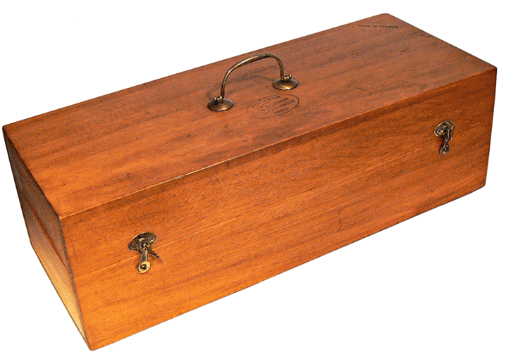 Les différents éléments constituant l'ébulliomètre. Devant le coffret de rangement : la chaudière, la lampe à alcool et la petite boite en carton contenant les mèches en soie de rechange. Au premier plan, la règle ébulliométrique. Sur le couvercle : le réfrigérant à reflux ou condenseur, le tube jaugé en verre permettant de prélever la quantité d'eau ou de vin nécessaire à l'analyse et le thermomètre de précision gradué de 86 à 101°C. |