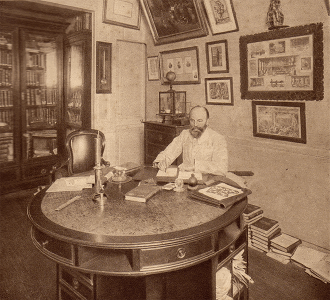 Jules DUJARDIN collaborateur puis successeur de Jules SALLERON en 1889. Devant lui, l'ébulliomètre accompagné de la règle de détermination du degré alcoolique. Par terre, contre le mur, on remarque les piles de l'ouvrage "NOTICE SUR LES INSTRUMENTS DE PRÉCISION appliqués à l'ŒNOLOGIE". Celui d'où nous avons tiré cette photographie est, peut-être là... |