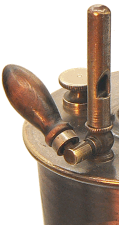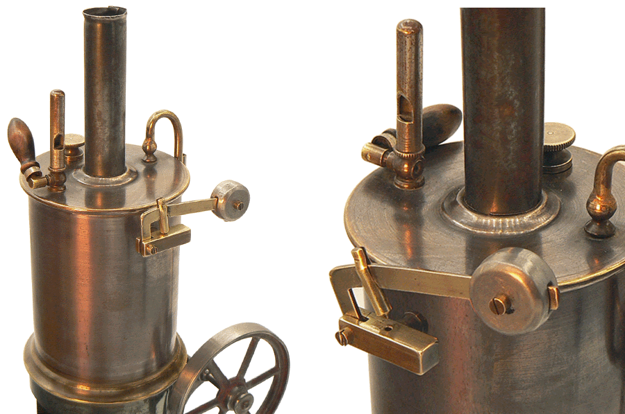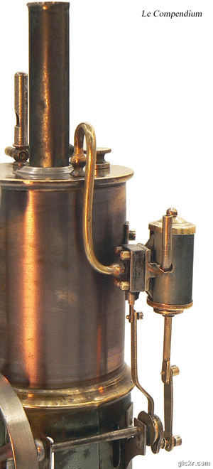 Près du bouchon de remplissage de la chaudière, le moteur est muni d'un sifflet commandé par une petite manette en bois, de 22 mm de longueur. |