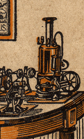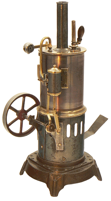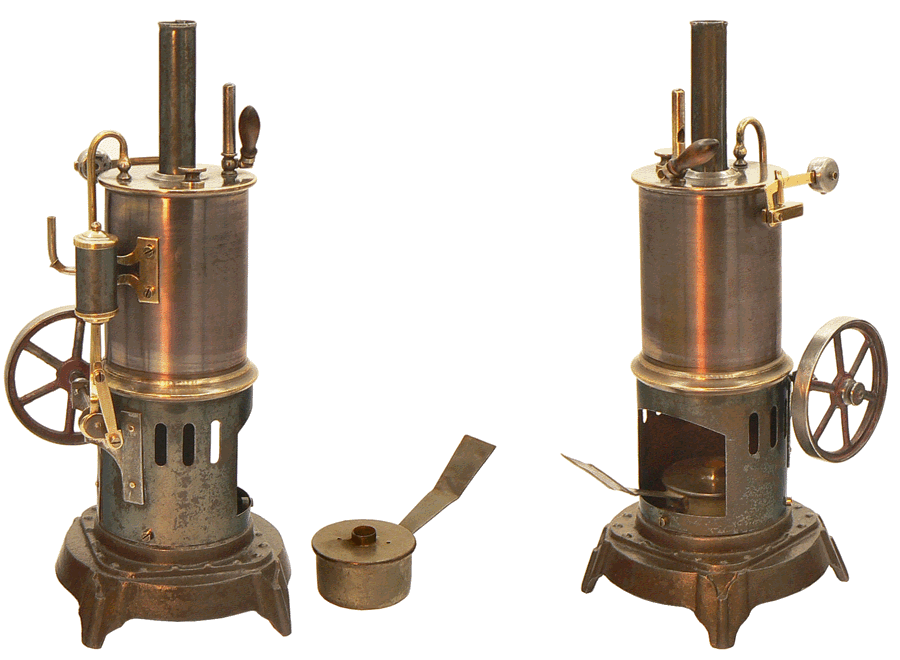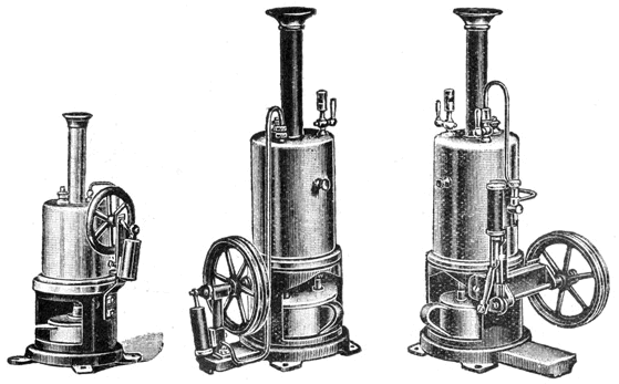 Trois moteurs à vapeur verticaux sont proposés par GeP (Georges Péricaud) dans le catalogue de 1922. Les prix vont de 17,50 francs pour le petit modèle, à 65 francs pour le modèle de droite, également représenté sur la couverture en couleur du catalogue, "à chaudière en laiton, soupape à cône rodé, sifflet, foyer tôle noire, bâti fondu avec palier supportant le moteur, volant de 80 mm". |