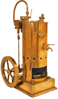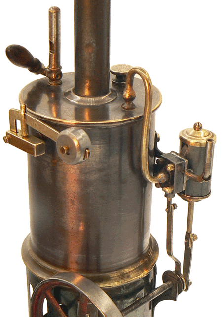 Moteur à vapeur, vertical, à sifflet. Hauteur 24 cm, volant de 6,5 cm. Vers 1910 |