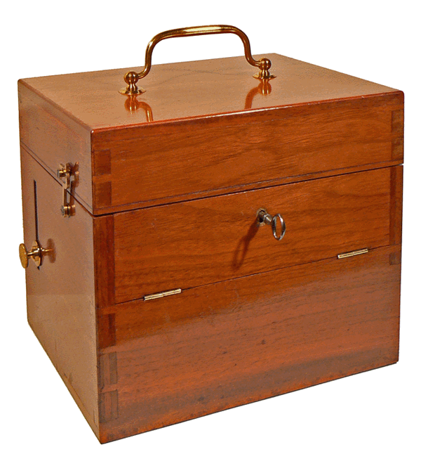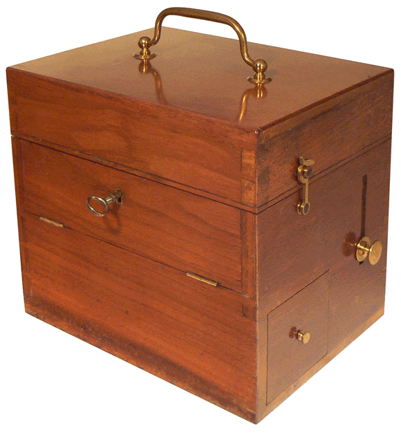 Coffret d'appareil à courant continu ("courant gavanique") en acajou verni - Dimensions : 24 x 18 x 21 cm - Vers 1900 |